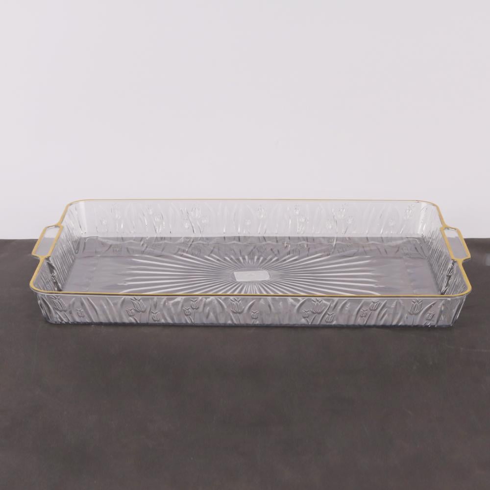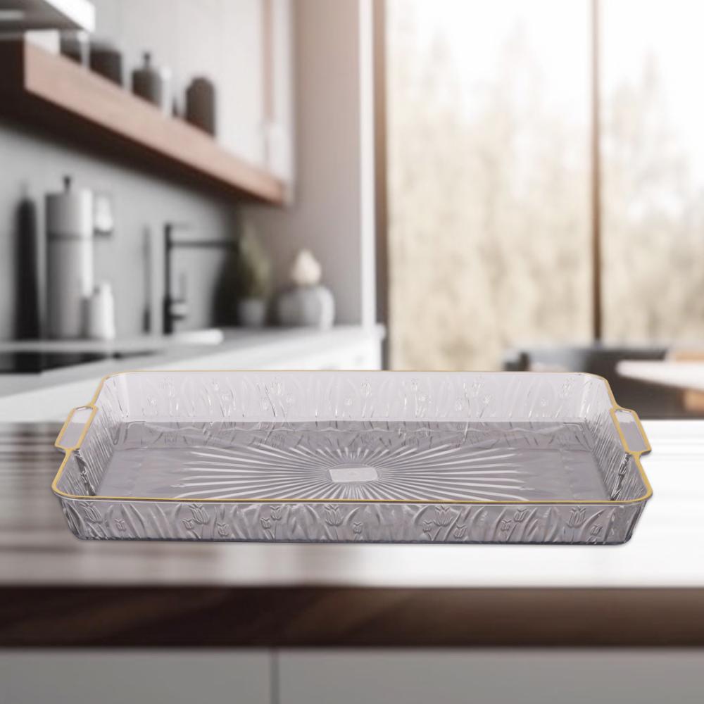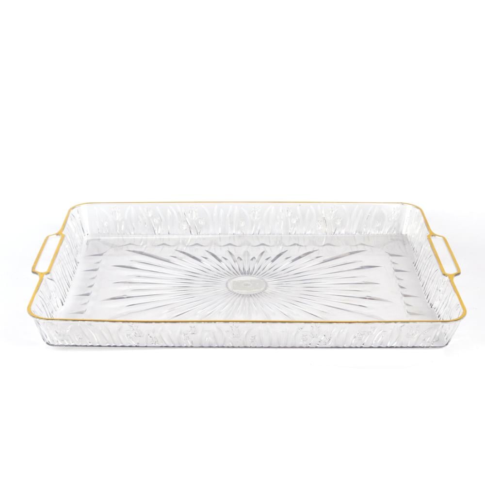 مزيج من خامة الأكريليك الشفافة، النقوش الراقية، والحواف المذهبة يجعلها قطعة فريدة وأنيقة تناسب جميع المناسبات.