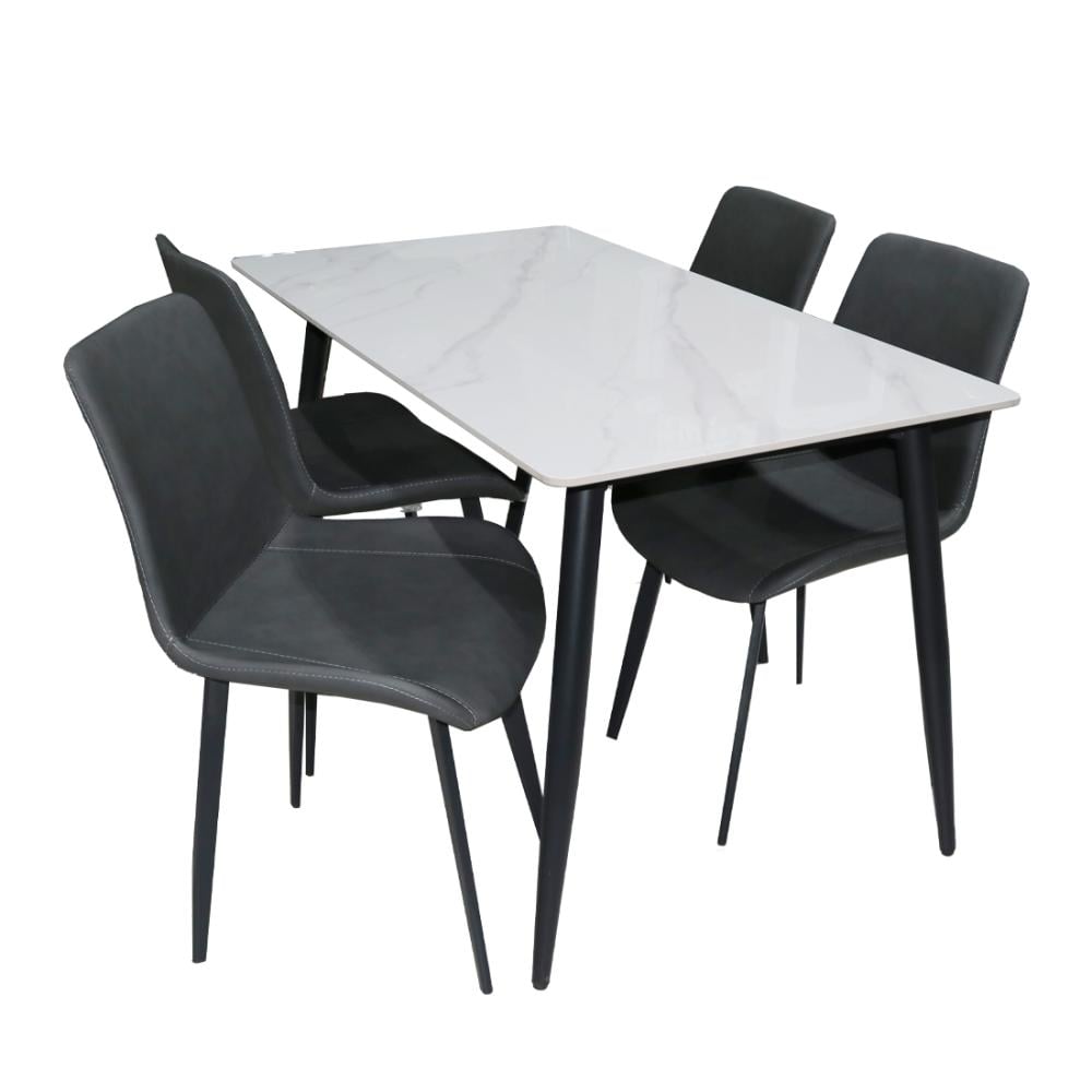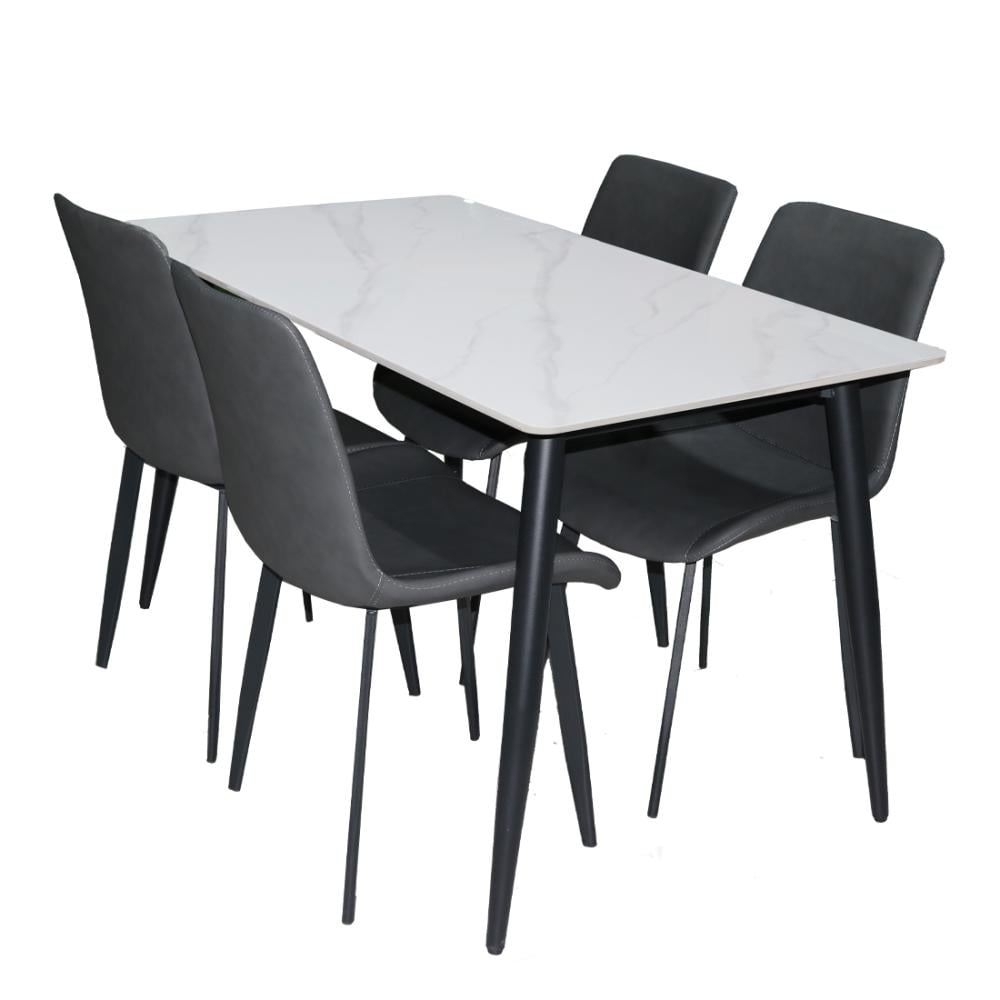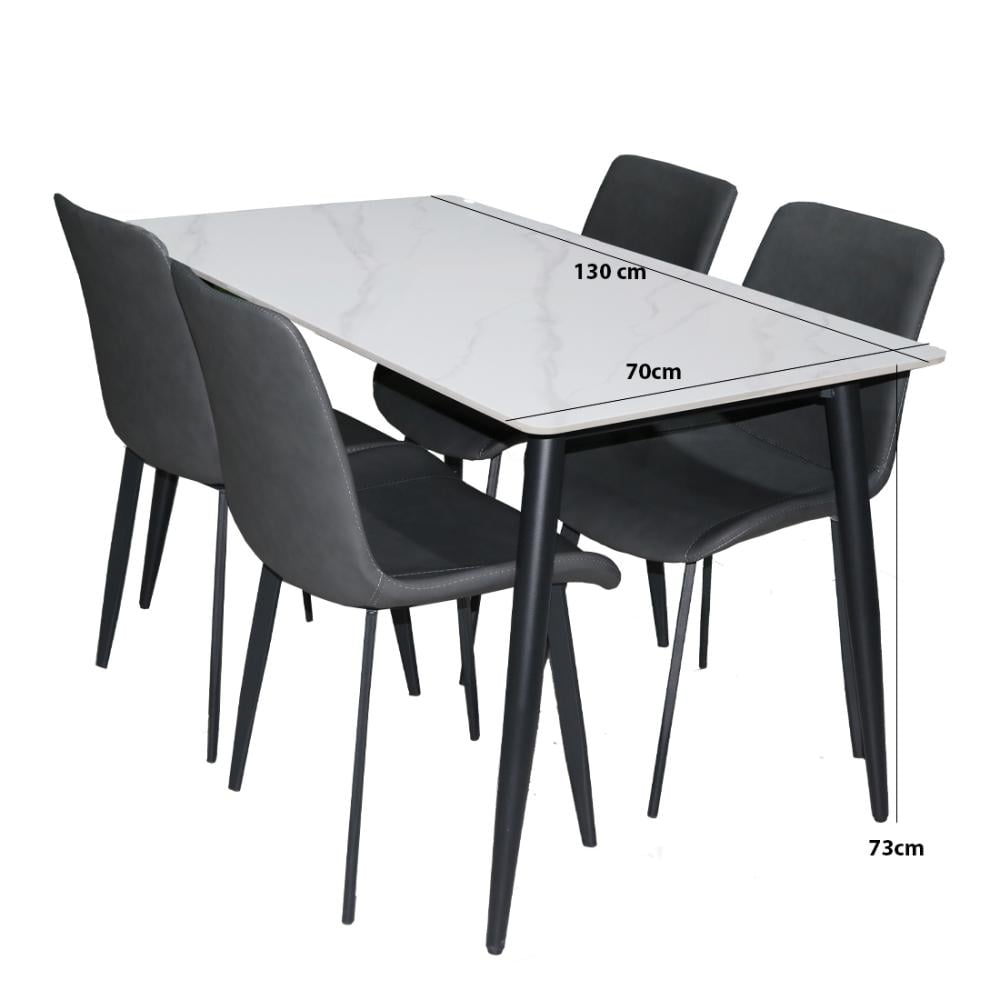 نبذة عن المنتج:أضف لمسة من الأناقة العصرية والفخامة إلى غرفة الطعام الخاصة بك مع طقم طاولة الطعام بتصميم سيراميك أبيض فاخر وأربع كراسي بلون رصاصي أنيق. يتميز هذا الطقم بتصميمه العصري الذي يجمع بين البساطة والرقي، مما يجعله الخيار الأمثل لكل من يبحث عن التوازن بين الجمال والعملية. الطاولة مصنوعة من سطح سيراميك أبيض عالي الجودة بنقشة رخامية جذابة تضفي لمسة من الفخامة، بينما الكراسي مبطنة ومغطاة بخامة مريحة وناعمة باللون الرصاصي الراقي، ما يمنحك تجربة جلوس مريحة وأنيقة في آنٍ واحد.
