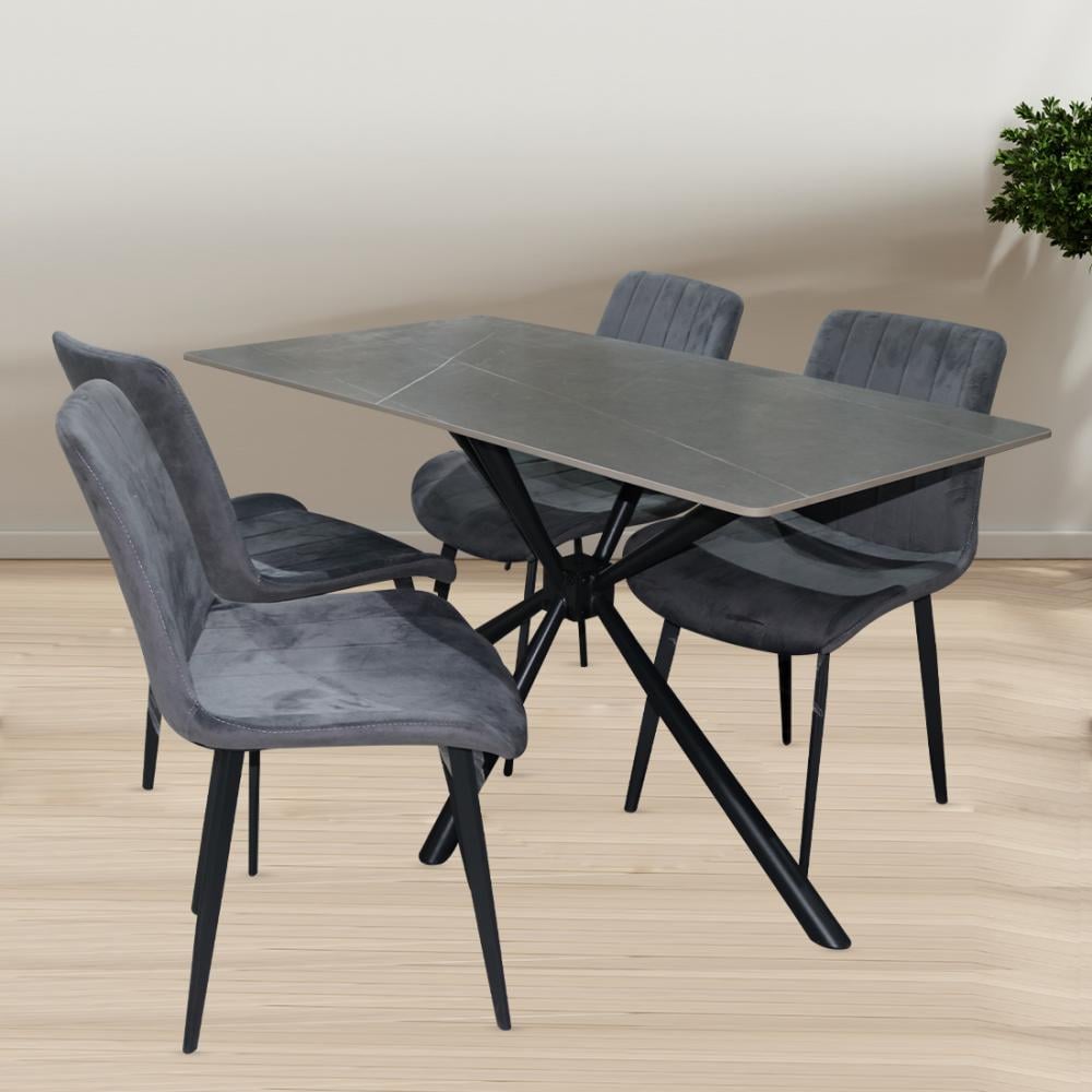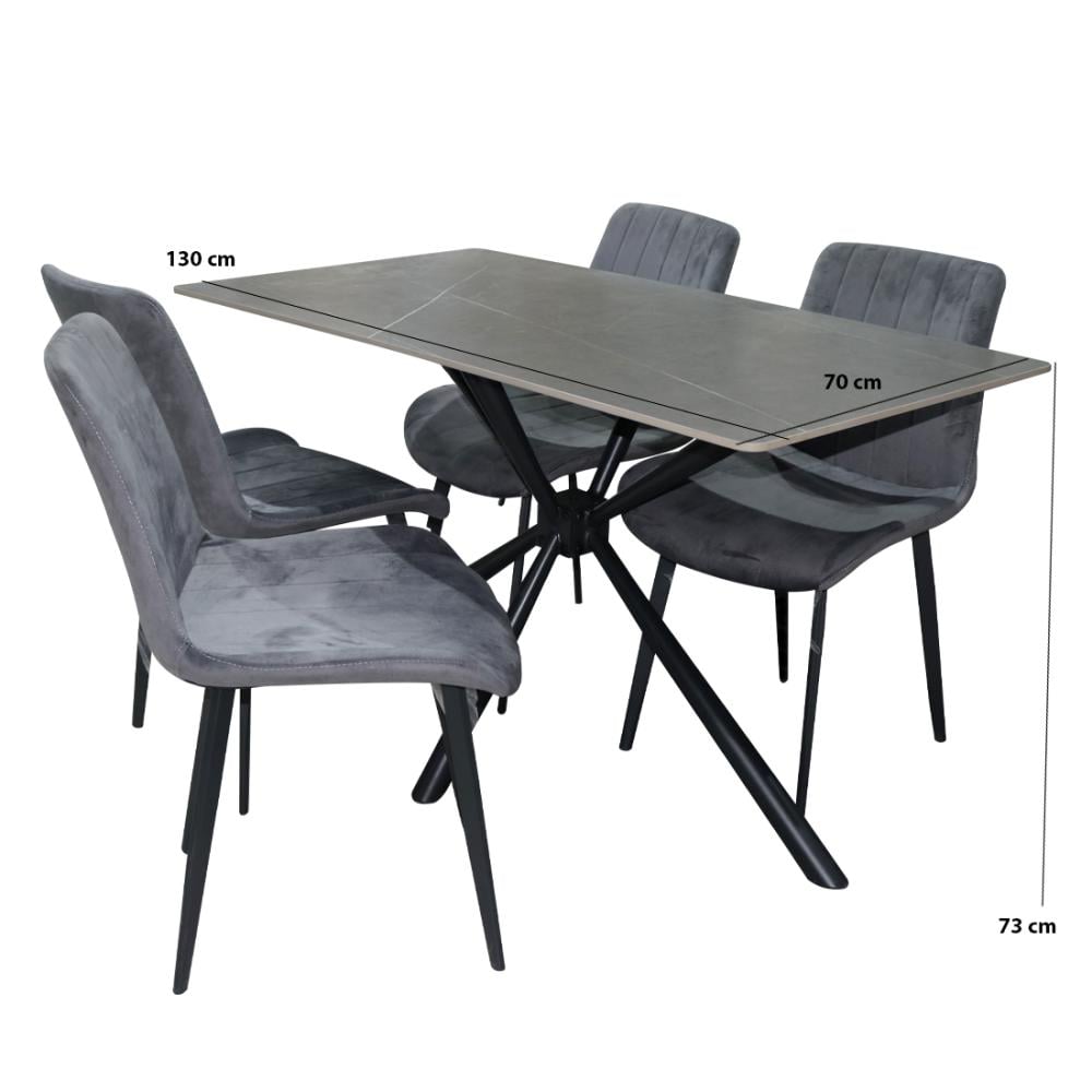 - الكراسي مغطاة بقماش مخملي ناعم بلون رصاصي أنيق.