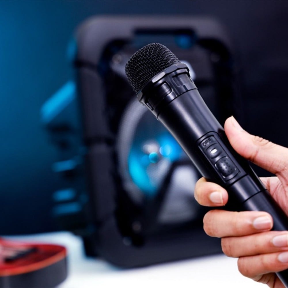 - PARTY MODE, TRAVEL READY – Easy to activate coloured lights to pulsate the beat of the music. Includes remote control and wired karaoke microphone for singing your favourite songs. The speaker is compatible with the iPhone, Android phones and other Bluetooth compatible devices. The 8 inches super loud Bluetooth speaker. Charge it fully, it is ready to take you on your next adventure.